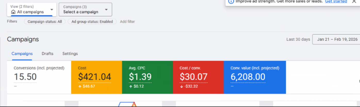 Nearly 15x return on ad spend. $6,208 in conversion value on $421 spent. Trips coming in during months that used to feel like a write-off.