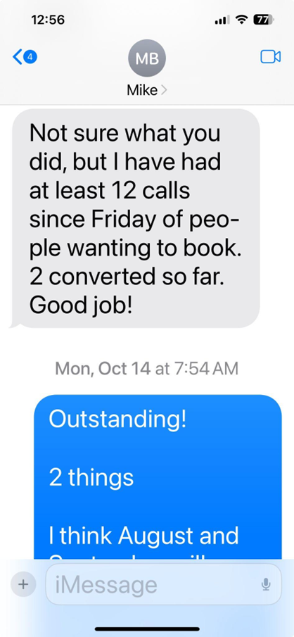 Sure, some clients see results right away. We recently had one client book a trip within an hour of launching their ads.